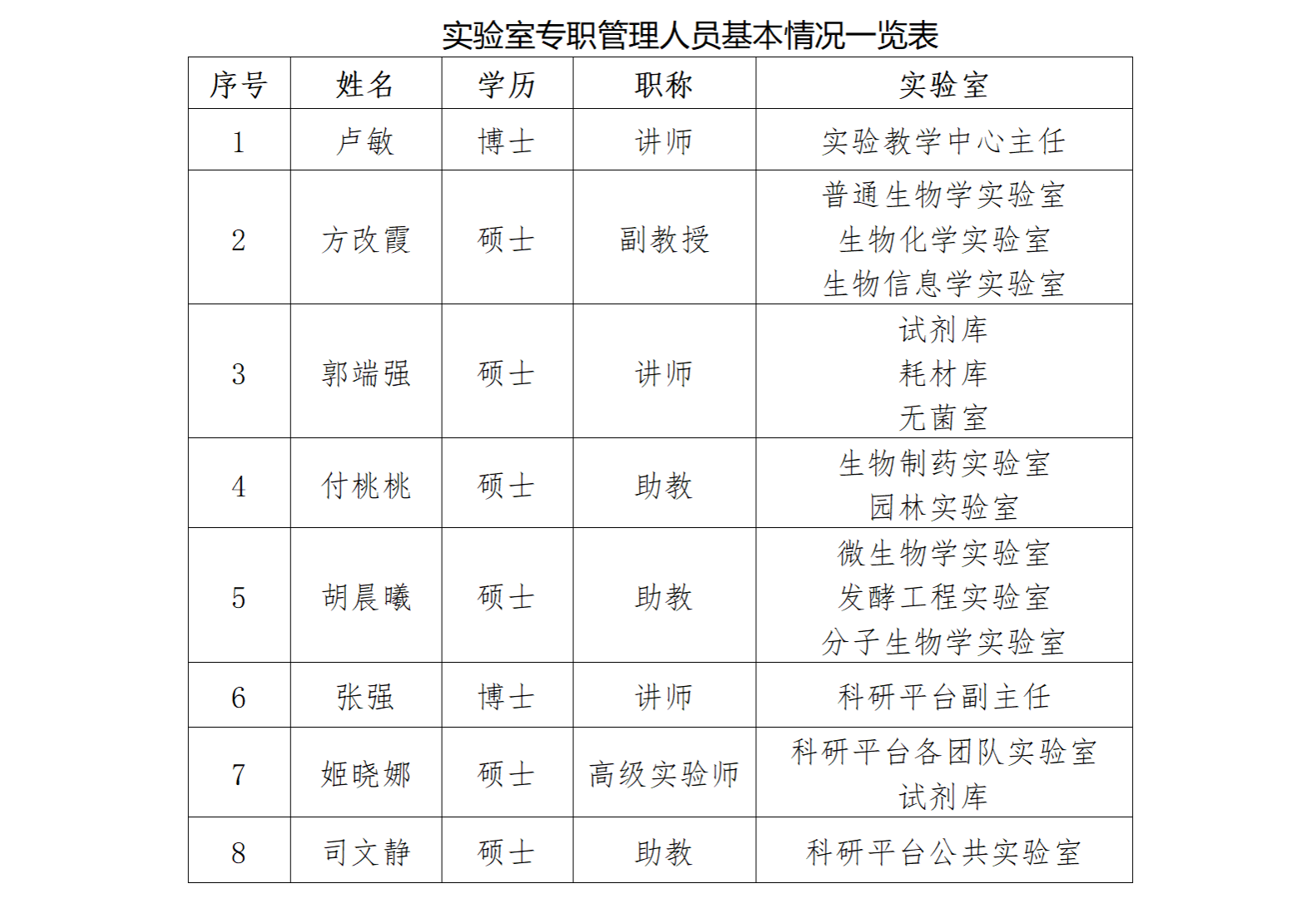 beats365实验教学中心现有实验室专职管理人员8人,负责教学实验室和科研平台实验室的日常管理工作,其中高级实验师1人,副教授1人,讲师3人,助教3人。
