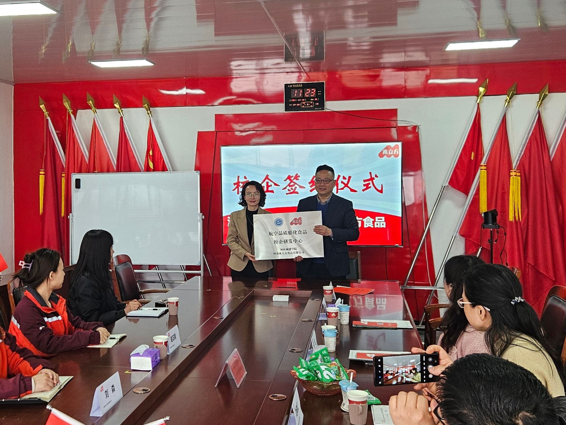 随后,双方代表共同签署了共建校企研发中心的合作协议,并共同为“航空品质膨化食品校企研发中心”揭牌。