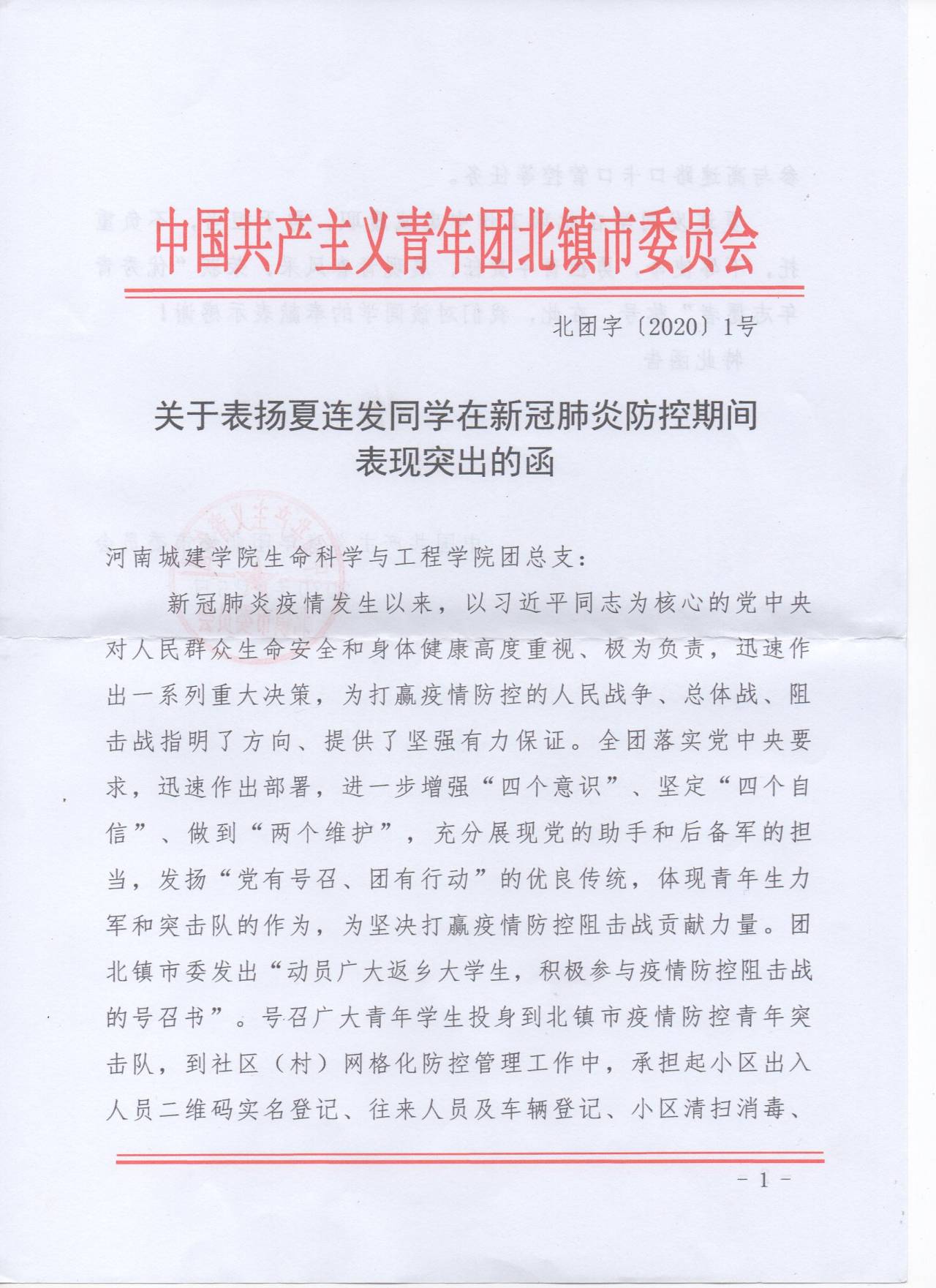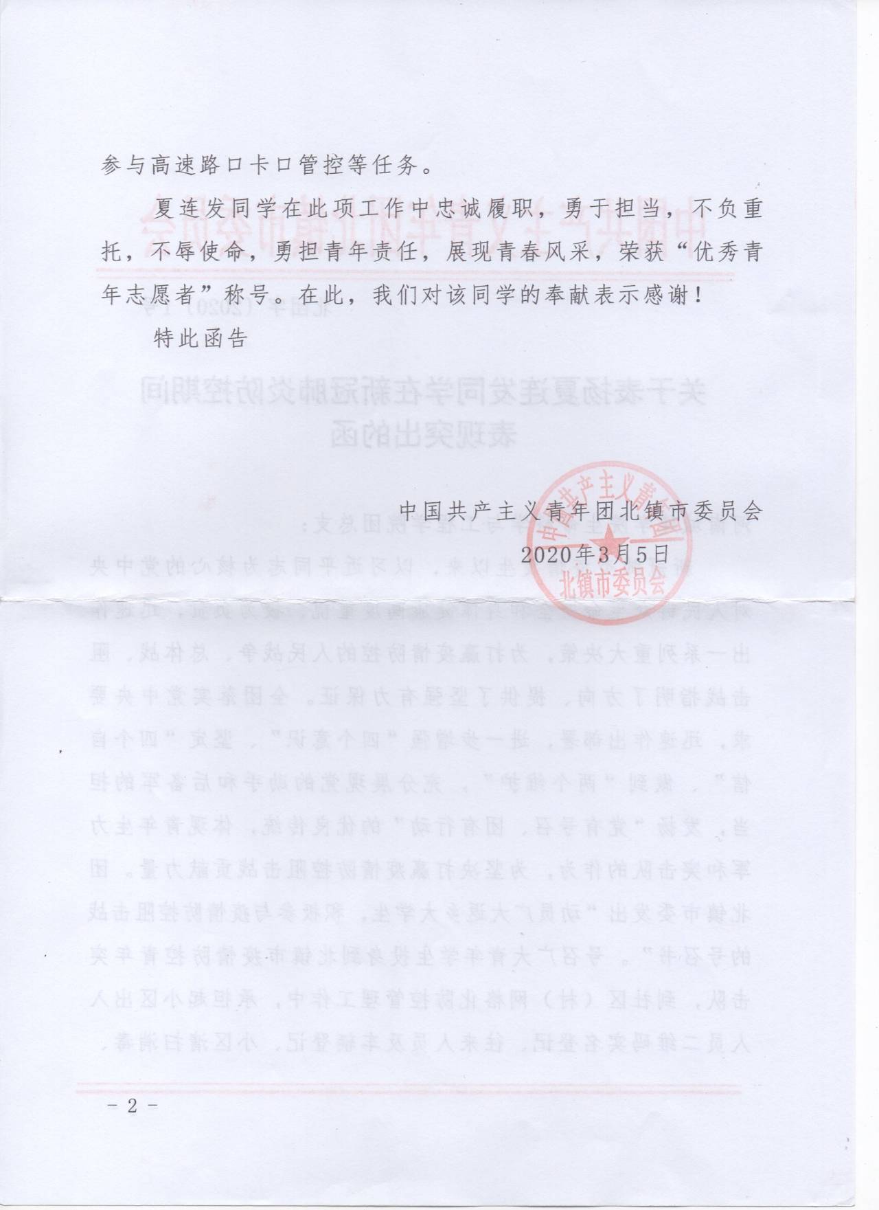 (通讯员:李 赫 董静荟)疫情就是命令,防控就是责任。在疫情防控的关键时期,beats365员工夏连发积极主动投身家乡辽宁镇北市疫情防控青年突击队,并因他在疫情防控工作中表现突出,获得北镇市团委会授予的“优秀青年志愿者”荣誉称号。