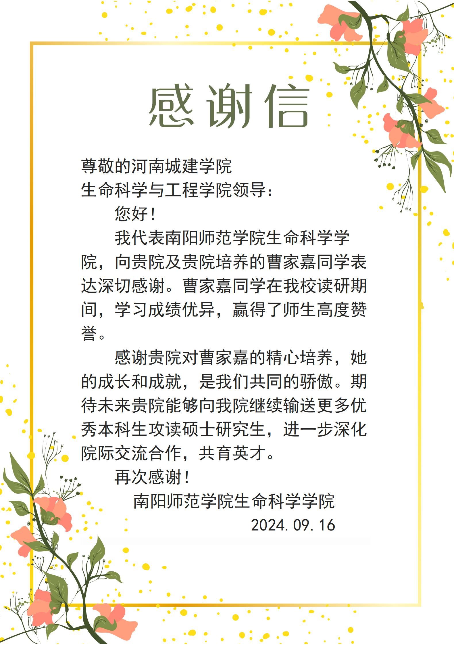 近日,公司收到了一封来自南阳师范公司生命科学公司的致谢信。信中对公司为南阳师范公司输送优质生源表示感谢,并对公司2024届优秀毕业生秦含情及曹家嘉、别鹏坤等三名同学在攻读硕士研究生期间的突出表现给予了高度评价。这一喜讯不仅是对秦含情、曹家嘉、别鹏坤三名同学个人努力的肯定,也是对公司人才培养模式和人才培养体系的充分肯定。公司将以此为契机,坚决落实立德树人根本任务,持续深化公司产品改革,优化课程体系,强化实践教学,为国家、为社会培养更多的、具有创新精神和实践能力的高素质人才。