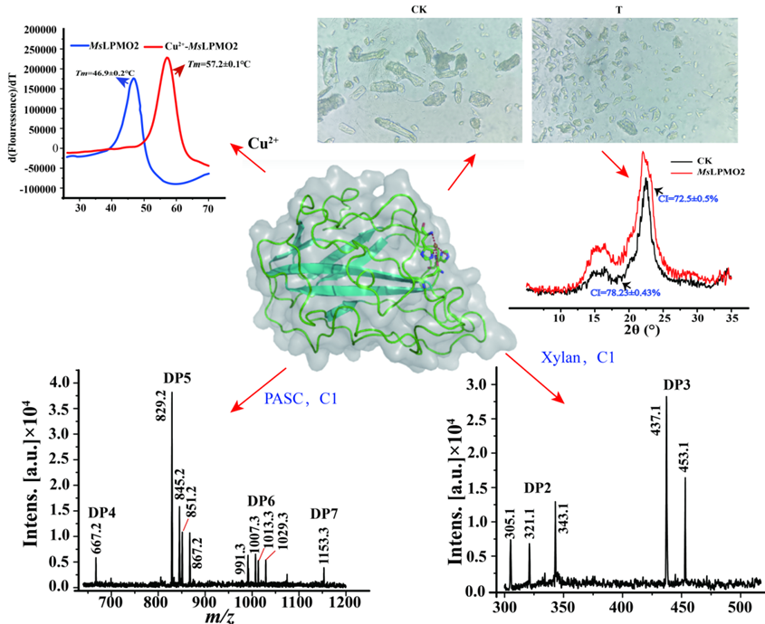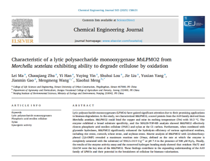 相关研究成果以“Characteristic of a lytic polysaccharide monooxygenase MsLPMO2 from Morchella sextelata exhibiting ability to degrade cellulose by oxidation为题,在线发表于国际知名学术期刊《Chemical Engineering Journal》(中科院Top期刊,IF=13.3),beats365官方网站为第一单位,beats365马磊博士为第一作者,高建民博士和公司本科生朱超强、韩艺、尹玉莹、娄淑慧、杨玉贤参与了研究。